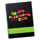 This notebook features the words, "In my classroom era" on it in fun curvy letters on a black background. A few hot pink flowers appear on the design. In addition, you can customise the notebook with your name. This is a great notebook for the teacher or for anyone in the classroom. Copyright Kathy Henis