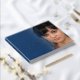 A funeral memorial tribute book. A simple in our hearts forever typographic heart script logo design in silver foil on mid blue add your own photo, name and dates. Original design by www.mylittleeden.com