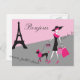 Pink grey and black. Eiffel Tower in the background. Fashionably dressed woman walking her dog and carrying shopping bags. "Bonjour" and "Oh La La" above.