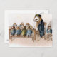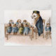Vintage illustration of a table of young owls with a "teacher" owl at the head of the table. On a chair behind is one owl wearing a dunce hat