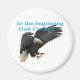 "In the beginning, God Created" in bold blue text superimposed on a Bald Eagle in flight.