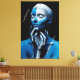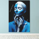 This drawing was created by #LeoPepeDesign, with the help of artificial intelligence. It is suitable for a creative and bold furnishing line. The human figure in this image has skin painted blue and holds its hands near its neck, creating an elegant and artistic pose. The use of the colour blue and the position of the figure's hands as distinctive elements of the image which conveys an artistic and intense atmosphere.