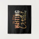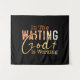 Tapestry depicts simple gold and white script on a black background. It features a cross and an inspirational Christian quote, "In the waiting, God is working."