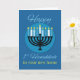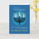 A First Hanukkah in your new home is a special celebration. This card will honour that gift. Blue backgrounds enhances the message. Lighting the centre is a menorah of various colours of blue and white.