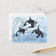 Incredible watercolor orcas art of swimming and jumping orcas and a baby orca with water splashes and waves.