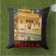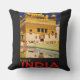 Visit India is a vintage travel poster. with a gold coloured Indian building and people around a reflecting pool. India State Railways Bureau by Fred Taylor, 1930 - 1940.