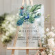 Peacock theme wedding welcome sign featuring a beautiful peacock, feathers and tropical leaves.