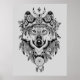 This design features a portrait of a wolf wearing tribal feathers and a dreamcatcher.