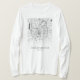 Modern graphic shows outline map of Indianapolis, IN layout with major streets, highways and bodies of water.