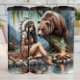 This image depicts a serene scene by a still body of water, reflecting the surrounding foliage. A young woman with long, wavy dark hair, adorned in indigenous-inspired clothing and a striking feathered headdress, sits barefoot on smooth rocks near a crackling campfire. A large brown bear gently rests its head on a fallen log behind her, looking down at the woman. Baskets and spears lean against a tree nearby, adding to the peaceful atmosphere of the waterside setting.
