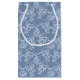 A chic Small Gift Bag, with typically Indian-style floral print in Indigo Blue on washed-out Denim Blue, outlined in White. Part of the Posh and Painterly 'Indigo' collection. This pattern can easily be adjusted to fit any Gift Bag.