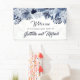 Beautiful border of dark blue flowers, light blue flowers and indigo berries and vines tops this engagement party welcome banner. Welcome and the wedding couple names are written in a large and dramatic font.