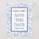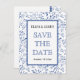 Indigo blue pattern with leaves and a white frame with scalloped border adorn this Save the Date postcard. It is ideal for a summer wedding.