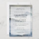 Elegant wedding invitation featuring an indigo blue watercolor landscape scene with misty smoky mountains .