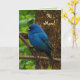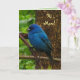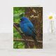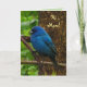 This Mother's Day card features the spectacular male Indigo Bunting perched on a branch amidst lush green leaves. This tiny bird is not often seen. He is shy and tends to avoid humans. His habitat is farmland, brush areas, and open woodlands. He has incredibly brilliant iridescent blue feathers and a very sweet song. The female is cute but a dull brown colour. Inside are two small buntings on a pale green gradient. The text can be customised to suit your needs.