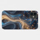 An abstract design with flowing lines and curves in various shades of blue. Golden sparkles and dots are scattered throughout, resembling stars or glitter. The overall effect is reminiscent of a swirling galaxy or fluid motion, creating a sense of movement and depth. The contrast between the dark blue hues and the bright gold elements makes the image visually striking.