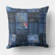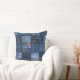 A seamless indigo patchwork pattern throw pillow featuring floral details and textured plaid squares. The mix of denim blues, delicate blossoms, and stitched textures creates a cosy boho aesthetic.