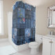 A seamless indigo patchwork pattern shower curtain featuring floral details and textured plaid squares. The mix of denim blues, delicate blossoms, and stitched textures creates a cosy boho aesthetic.