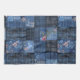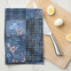 A seamless indigo patchwork pattern kitchen towel featuring floral details and textured plaid squares. The mix of denim blues, delicate blossoms, and stitched textures creates a cosy boho aesthetic.