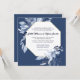 An elegantly-shaped geometric gold frame is surrounded by blue flowers in the upper left and bottom right corners. The flowers are a very pretty combination of dark navy blue flowers to the lightest silver blue. The wedding details are in the centre on white. Deep indigo blue frames the outer portion of the geometric and floral design. The back of the design is also indigo blue and has a floral arrangement in the centre with the wedding couple's names below.