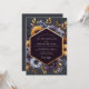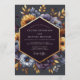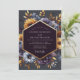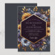 This elegant wedding design features a dramatic display of moody botanicals against a dark, atmospheric backdrop. Vibrant marigold sunflowers and cool-toned anemones bloom alongside deep purple peonies. Luminous golden foliage weaves throughout the arrangement, adding a sophisticated warmth to this rich and painterly floral composition.