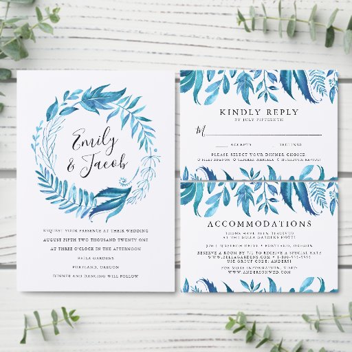 Stylish and elegant botanical wedding reception card features a spray of indigo and teal blue watercolor leaves designed to coordinate with our Indigo Leaves wedding collection. Personalise the elegant reception cards by adding your wedding reception details.