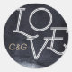 Modern chic simple typographic LOVE design and couple's monogram on dark indigo blue watercolor background, great for modern wedding, evening wedding or nautical wedding, and wedding anniversary parties.