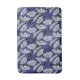 White palm leaves on an indigo blue background, layered with more blue palm fronds.