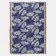 White palm leaves on an indigo blue background, layered with more blue palm fronds.