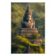 Tranquil scenery of Indonesian Buddha Statue sitting next to green mountains.