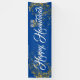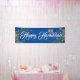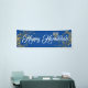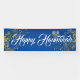 Select from indoor or outdoor, with or without grommets. Shown in Blue with White text "Happy Hanukkah" in a fancy script with two Gold looking swirls of stars on each end.