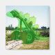 A happy green cartoon stegosaurus sitting on the ground staring up at the sky to the left of the frame superimposed over the top of a photo of an old machine with large wheels, forming a "skeleton" for the dinosaur.