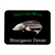 Tying into a monster sturgeon is an experience of a lifetime. Catch one and you are hooked. Full colour life like image of a giant sturgeon with the text Infected With Sturgeon Fever in the background. Available in many colours.