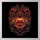 A demonic figure, shrouded in darkness and adorned with horns and skeletal features, performs a ritual. The figure's hands are outstretched towards a glowing skull resting on a pedestal, surrounded by flames and swirling smoke.