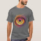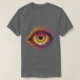 This striking t-shirt design showcases an intense, fiery eye that captivates with its detailed realism and vibrant colours. The eye's iris is ablaze with shades of fiery orange, yellow, and deep red, creating a mesmerising, molten effect. The pupil is a stark black, providing a dramatic contrast to the vivid hues surrounding it. The eye's lashes and surrounding area are depicted with intricate line work that transitions from bright yellow and orange at the centre to deep purples and pinks at the outer edges, adding to the sense of heat and intensity.