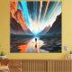 A lone traveller walks among towering mountains mirrored in calm waters, while the sky bursts with cosmic beams of light. The scene blends nature and universe, inviting reflection on the inner journey and the vastness of human dreams.