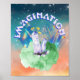 a mesmerising watercolor artwork featuring a stunning purple crystal, elegantly rendered against a cosmic galaxy backdrop. Dazzling rainbow flares burst forth from the crystal, adding an enchanting touch of colour and vibrancy to the scene. Above this captivating imagery, the word "Imagination" gracefully arches in a unique, flowing font, inviting viewers to explore the limitless boundaries of creativity and inspiration.