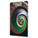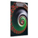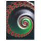 This work features a complex, swirling fractal pattern with a spiral structure that appears to extend infinitely inward. The primary colors are vivid red and lush green, contrasting against a deep, dark background. Along the spiral's path, intricate, smaller fractal shapes repeat, creating a sense of depth and movement. The red fractal elements resemble organic shapes, almost like blooming flowers or curled leaves. The green tones gradually transition to silvery whites closer to the center, adding a glowing effect. Overall, the image evokes a feeling of infinite complexity and dynamic energy.