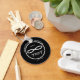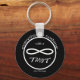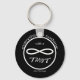 A graphic circle and infinity symbol with a quote from Kurt Vonnegut "Everything is nothing with a twist" on a keychain.