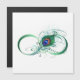 The symbol of infinity with a bright, green, artistic peacock feather on a white background. Tattoo style.
