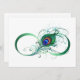 The symbol of infinity with a bright, green, artistic peacock feather on a white background. Tattoo style.