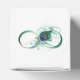 The symbol of infinity with a bright, green, artistic peacock feather on a white background. Tattoo style.