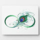 The symbol of infinity with a bright, green, artistic peacock feather on a white background. Tattoo style.
