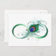 The symbol of infinity with a bright, green, artistic peacock feather on a white background. Tattoo style.