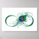 The symbol of infinity with a bright, green, artistic peacock feather on a white background. Tattoo style.
