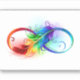 Artistically drawn infinity symbol with beautiful rainbow feather on white background. Tattoo style.