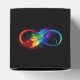 Artistically drawn infinity symbol with beautiful rainbow feather on white background. Tattoo style.