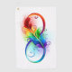 Artistically drawn infinity symbol with beautiful rainbow feather on white background. Tattoo style.