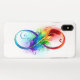 Artistically drawn infinity symbol with beautiful rainbow feather on white background. Tattoo style.