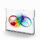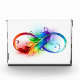 Artistically drawn infinity symbol with beautiful rainbow feather on white background. Tattoo style.